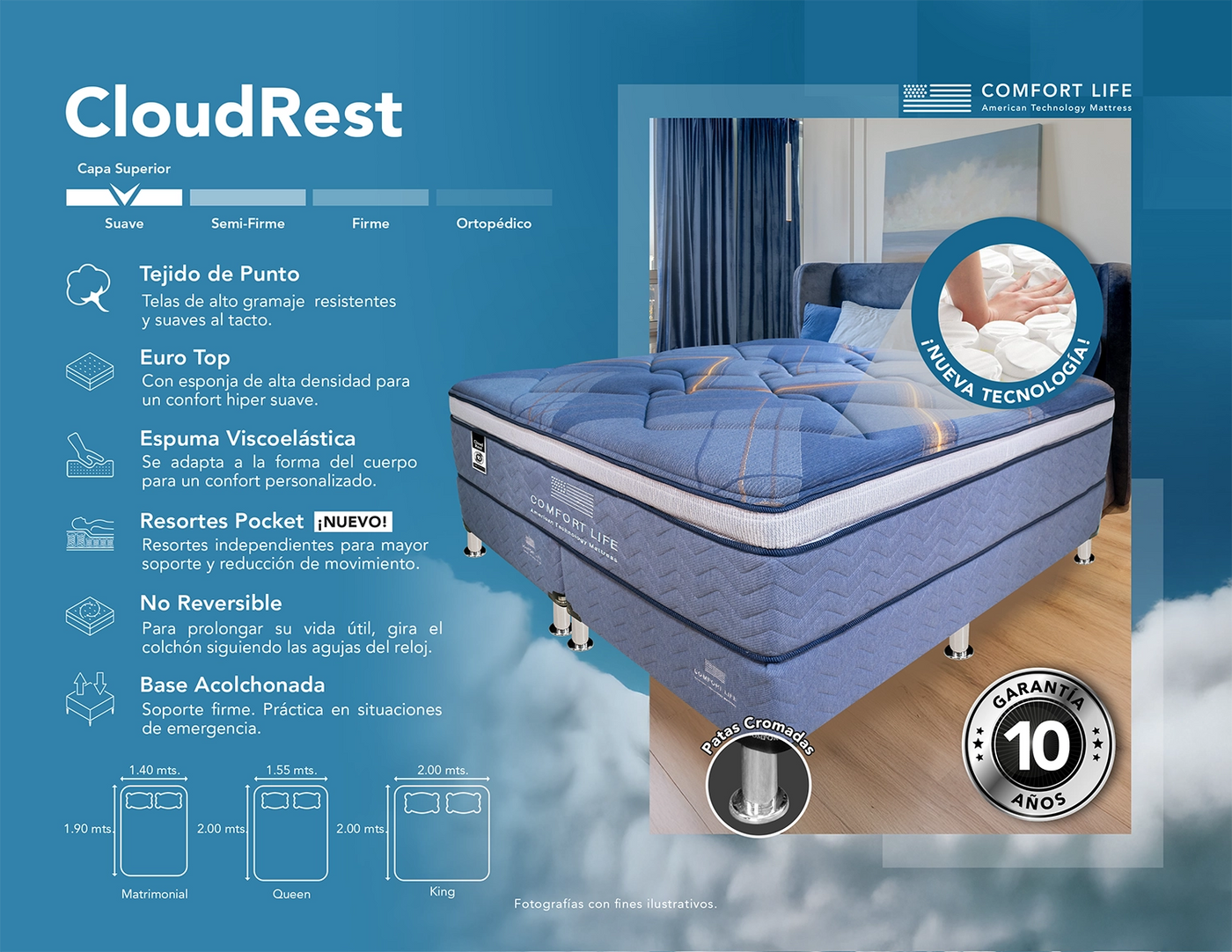 El nuevo CloudRest de Comfort Life combina viscoelástica, euro top y resortes pocket para un descanso envolvente. Suave al tacto, con soporte inteligente y estética moderna, es ideal para quienes buscan dormir bien y con estilo. Disponible en tres medidas. Garantía de 10 años.