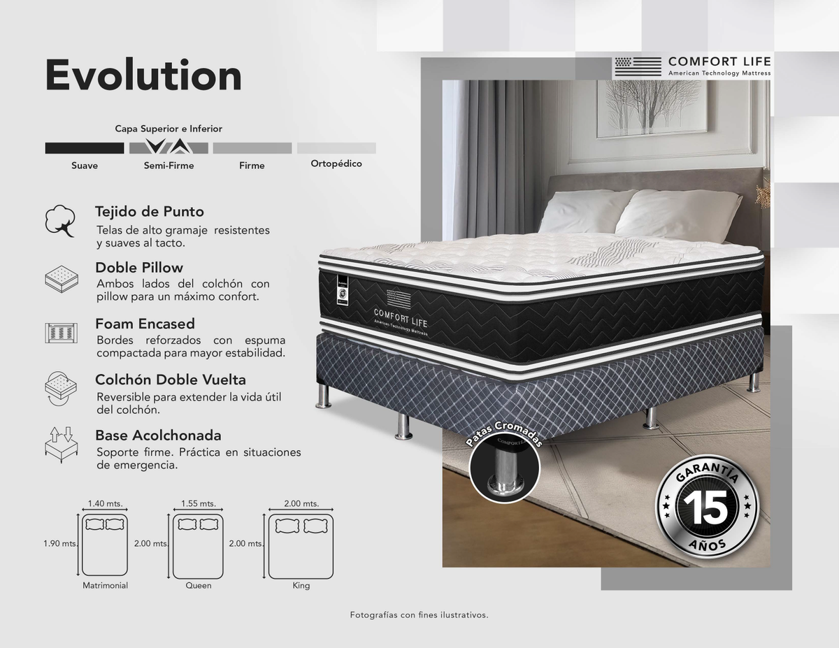 Respaldado por una garantía de 15 años, el Comfort Life Evolution no sólo es una inversión en bienestar, sino una garantía de rendimiento a largo plazo.